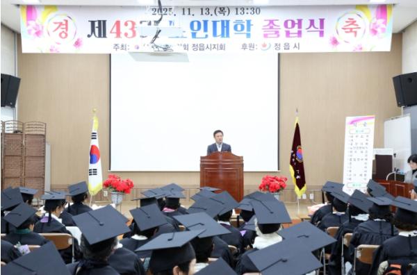 [한국제일신문, 이미란기자] 대한노인회 정읍시지회(지회장 이호춘) 부설 노인대학(학장 김동규)이 지난 13일 지회 2층 강당에서 ‘2025년도 제43기 대한노인회 부설 노인대학 졸업식’을 열었다.