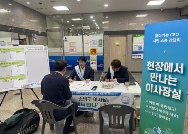 여수시도시관리공단(이사장 송병구)은 시민과 직접 소통하기 위한 현장 행정의 문을 열었다고 밝혔다. 지난 11월 13일 진남수영장과 장애인국민체육센터, 14일 망마국민체육센터에서 찾아가는 CEO 시민 소통 간담회 ”현장에서 만나는 이사장실“을 운영하며 시민과 소통하는 자리를 가졌다.