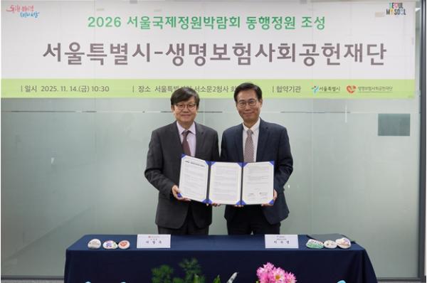 [한국제일신문, 김성옥기자] 서울시는 생명보험사회공헌재단과 11월 14일 업무협약을 맺고 2026년 서울숲에서 개최되는 서울국제정원박람회에 동행정원을 조성한다고 밝혔다. 이로써 내년 서울숲에서는 ‘마음의 전화’를 갖춘 ‘마음정원’을 만나볼 수 있게 된다.