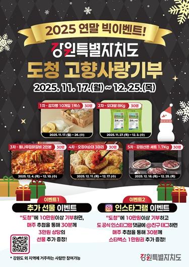 [한국제일신문, 김성옥기자] 강원특별자치도는 연말을 맞이하여 국민들의 연말 정산을 돕기 위해 고향사랑기부 빅이벤트를 실시한다고 밝혔다.