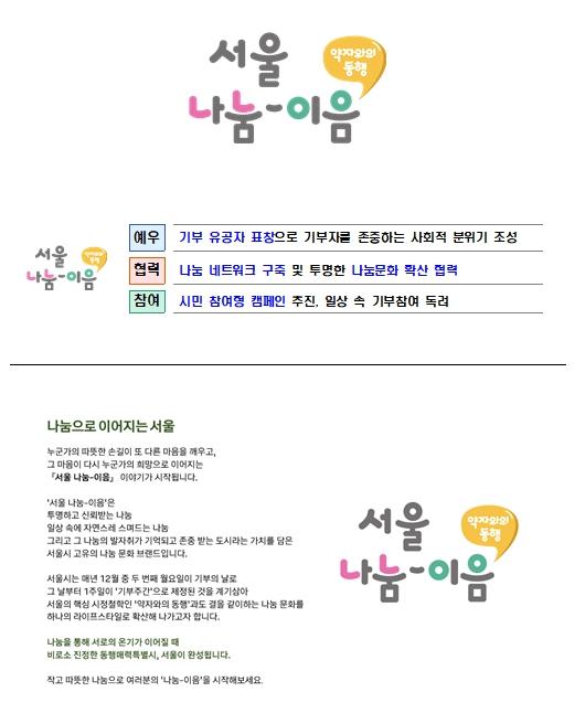 아울러 서울시는《서울 나눔-이음 》브랜드 출범을 기념하여 온라인 기부 플랫폼 네이버 해피빈과 함께, 마음만 있다면 누구나 나눔에 동참할 수 있는 캠페인을 준비했다.