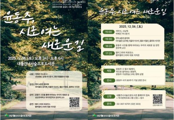 내를 건너서 숲으로 도서관 관계자는 “이번 행사를 통해 윤동주 시인의 작품을 보며 시대를 초월한 문학적 정신을 재조명하고, 시가 지닌 순수함과 성찰의 언어를 통해 시민들이 자신의 삶과 사회를 돌아보는 시간이 되기를 바란다”라고 말했다.