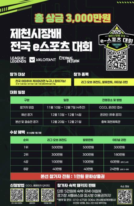 한편 제천시장배 전국 e-스포츠대회는 2023년 3천여 명이 참여한 가운데 첫 대회를 치른 이후, 2024년에는 선수단과 관람객 4천 4백여 명이 참여하는 등 전국 규모 대회로 성장했다. 올해 3회째를 맞이한 이번 대회는 총상금 3천만 원 규모의 명실상부 중부권 최대 아마추어 e-스포츠 대회로 자리매김했다.