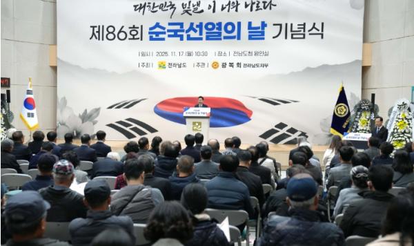 [한국제일신문, 윤진성기자] 전라남도와 광복회 전남도지부(지부장 송인정)는 17일 전남도청 왕인실에서 ‘제86회 순국선열의 날 기념식’을 개최하고, 순국선열의 희생과 독립정신을 기렸다.