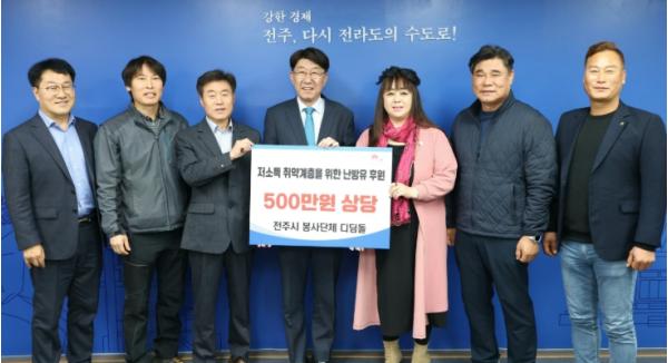 [한국제일신문, 김성관기자] 전주지역 봉사단체인 ‘디딤돌’(회장 박지윤)은 17일 전주시장실을 찾아 지역 저소득 취약계층 20세대에 전달할 예정인 500만 원 상당의 등유 쿠폰 사용권을 기탁했다.