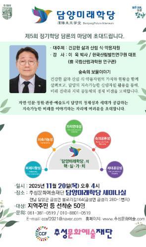 [한국제일신문, 윤진성기자] 추성문화예술재단이 운영하는 담양미래학당은 오는 11월 20일 오후 7시, 담양군 금성면에 위치한 담양미래학당 세미나실에서 제5회 정기학당 담론마당을 개최한다.