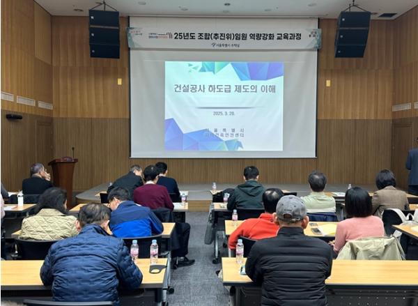 올해 3월과 8월 정비사업조합 임원을 대상으로 공정한 하도급 계약 문화 정착을 위한 ‘2025년 정비사업 아카데미 조합 임원 역량강화 교육과정’에 ‘건설공사 하도급 이해 과정’을 개설해 성황리에 교육을 마쳤다.