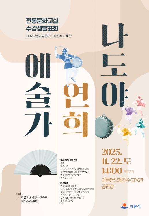 [한국제일신문, 김성옥기자] 강릉단오제전수교육관은 오는 22일 14시 강릉단오제전수교육관 공연장에서 ‘2025년 전통문화교실 수강생발표회'나도야 연희예술가'’를 개최한다.