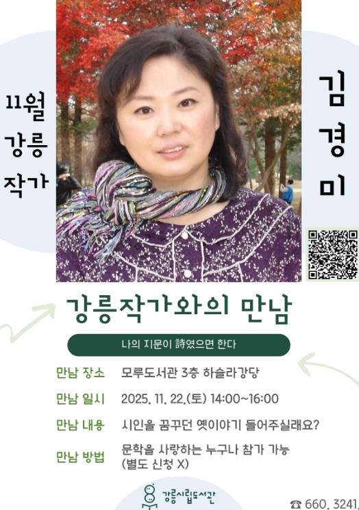[한국제일신문, 김성옥기자] 강릉시립도서관은 오는 22일 모루도서관 3층 하슬라 강당에서 김경미 작가와 함께하는 제16회‘강릉작가와의 만남’을 운영한다.