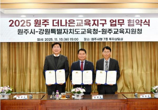 [한국제일신문, 김성광기자] 원주시는 지난 18일 시청 7층 투자상담실에서 ‘원주 더나은교육지구’ 지정 연장 업무협약을 체결했다. 협약식에는 원강수 원주시장, 신경호 강원특별자치도 교육감, 김성진 원주교육지원청 교육장이 참석했다.