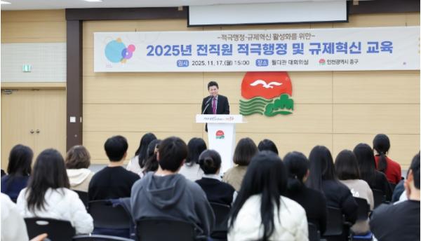 [한국제일신문, 김성옥기자] 인천시 중구는 지난 17일 중구청 월디관 대회의실에서 전 직원을 대상으로 ‘2025년 적극행정 및 규제혁신 교육’을 실시했다.