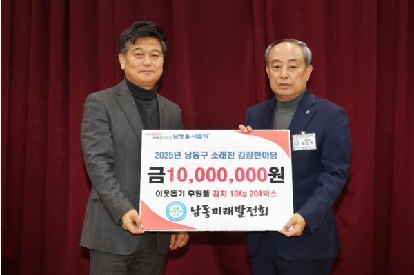 [한국제일신문, 김성옥기자] 인천시 남동구는 남동미래발전회(공동회장 정찬주)로부터 ‘2025 소래찬 김장한마당’의 성공적인 개최와 이웃돕기를 위한 후원금 1천만 원을 전달받았다고 19일 밝혔다.