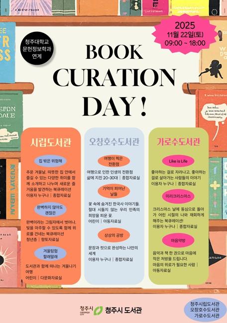 [한국제일신문, 김성옥기자] 청주시립도서관은 청주대학교 문헌정보학과(지도교수 김혜영)와 함께 오는 22일 오전 9시부터 오후 6시까지 △시립도서관 △오창호수도서관 △가로수도서관 등 3개 도서관에서 ‘북큐레이션 데이’를 동시에 개최한다고 밝혔다.