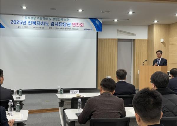 [한국제일신문, 윤진성기자] 전북특별자치도 감사위원회는 11월 19일 전북테크비즈센터에서 도 및 시·군, 도 교육청, 전북개발공사 등 산하기관 감사부서 직원 60여 명이 참석한 가운데 ‘2025년 전북자치도 감사담당관 연찬회’를 개최했다고 밝혔다.