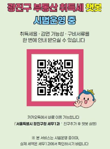 [한국제일신문, 김성옥기자] 광진구가 부동산 정책 변화에 따른 취득세 감면 확대와 직접 신고 증가에 대응하기 위해 카카오톡 기반 ‘부동산 취득세 안내 채팅로봇’을 시범 운영한다.