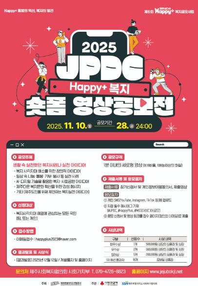 제주특별자치도개발공사(사장 백경훈)는 제주도사회복지협의회(회장 고승화), 제주사회복지공동모금회(회장 강지언)와 함께 오는 11월 28일까지 ‘2025년 JPDC Happy+복지 숏폼영상 공모전’을 개최한다고 밝혔다.