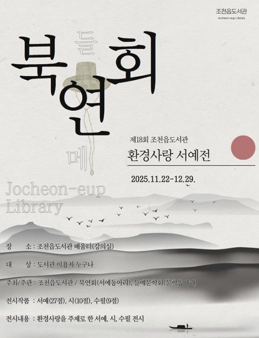 [한국제일신문, 김성옥기자] 제주시 조천읍도서관은 11월 22일부터 12월 27일까지 도서관 1층 배움터에서 ‘제18회 환경사랑 서예전’을 개최한다.