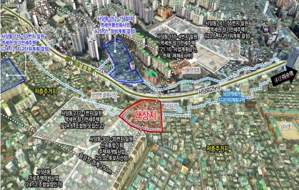 사업 대상지는 7호선 남성역과 사당로에 인접한 10,677.7㎡ 규모의 부지로, 과거 범진여객 버스 차고지로 사용됐으며 현재는 공영주차장으로 활용 중인 부지를 포함하고 있다.