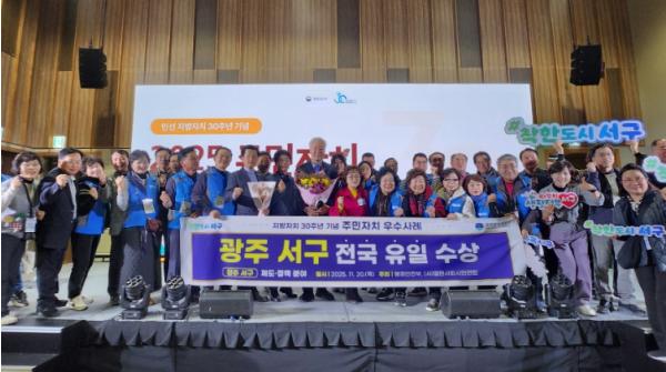 [한국제일신문, 윤진성기자] 광주광역시 서구가 마을 중심의 자치행정을 실현한 성과를 인정받아 행정안전부가 주관한 지방자치 30주년 기념 공모전에서 전국 기초자치단체 중 유일하게 2관왕에 올랐다. 서구는 20일 울산전시컨벤션센터에서 열린 주민자치 우수사례 공모전에서 풍암동 BI사업(주민자치 분야)과 거점-연계동 협력 시스템(제도정책 분야) 두 개 분야에서 모두 행정안전부장관상을 수상하며 총 특별교부세 1억5천만원을 확보했다.