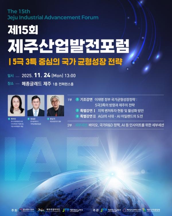 제주테크노파크(원장 지영흔, 제주TP)는 오는 24일 메종글래드 제주 1층 컨퍼런스홀에서 ‘5극 3특 중심의 국가 균형성장 전략’을 주제로 제15회 제주산업발전포럼을 개최한다.