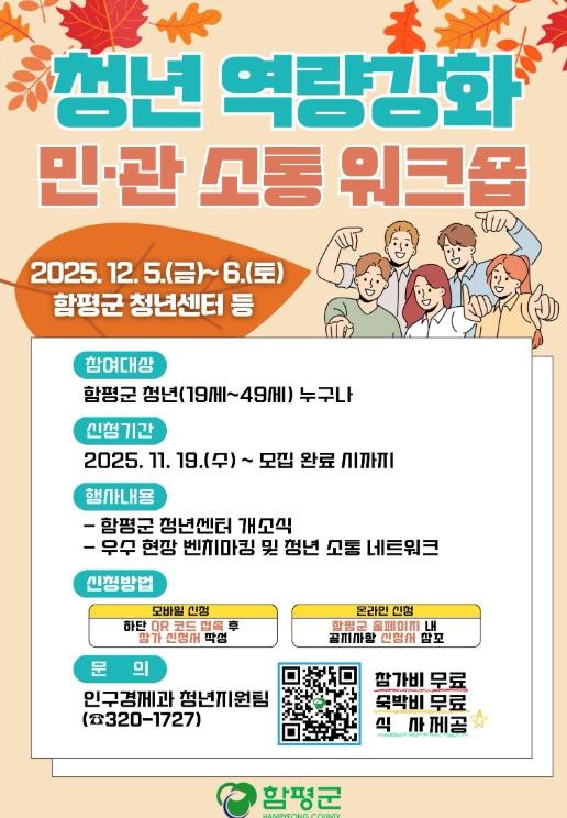 함평군은 21일 “관내 19~49세 청년을 대상으로 ‘청년 역량강화 민관 소통 워크숍’ 참가자 50명을 공개 모집한다”고 밝혔다.