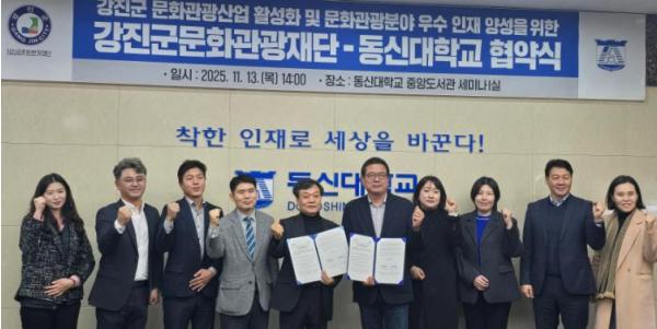[한국제일신문, 윤진성기자] 강진군문화관광재단이 최근 동신대와 문화관광산업의 미래 경쟁력 강화와 우수 인재 양성 상호협력에 관한 협약을 체결했다.