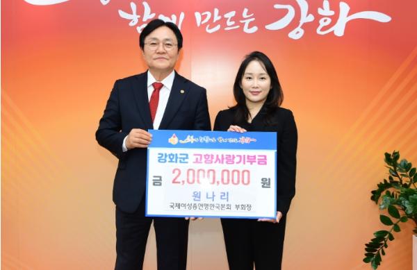 [한국제일신문, 김성옥기자] 강화군은 지난 20일 원나리 국제여성총연맹한국본회(KGFWC) 부회장이 올해 ‘강화군 고향사랑기부제’의 11번째 고액 기부자로 참여했다고 밝혔다.