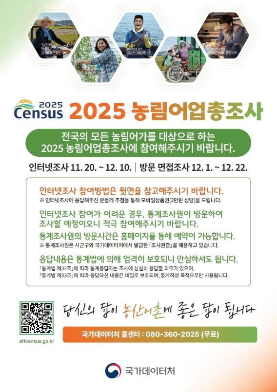 [한국제일신문, 김성옥기자] 강릉시는 11월 20일 목요일부터 오는 12월 22일 월요일까지 '2025 농림어업총조사'를 실시한다.