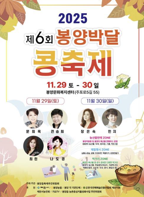 [한국제일신문, 김성옥기자] 한때 국민애창곡인 ‘울고 넘는 박달재’로 유명한 제천시 봉양읍에서 11월 29일부터 30일까지 2일간 봉양읍 주포리 소재 문화복지센터 일원에서 제6회 봉양 박달콩 축제가 개최된다.