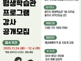 [한국제일신문, 김성옥기자] 충주시 평생학습관은 2026년 한 해 동안 정규 평생학습 프로그램을 담당할 강사 74명을 공개모집한다.