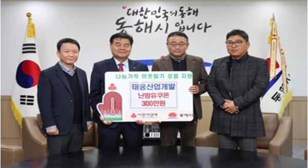 태웅산업개발(대표 이영웅)은 11월 21일 동해시청을 방문해 겨울철 난방비 부담으로 어려움을 겪는 취약계층을 위해 300만 원 상당의 난방유 쿠폰을 기탁했다.