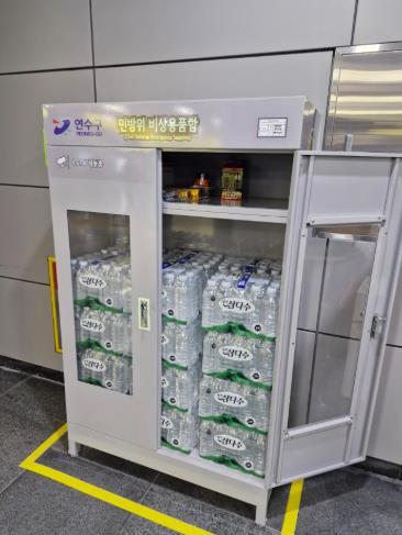 대형 비상용품함에는 재난 발생 시 활용할 수 있는 ▲식수, ▲응급키트, ▲손전등, ▲담요, ▲구급약품 등 생존 필수품이 비치되어 있다.