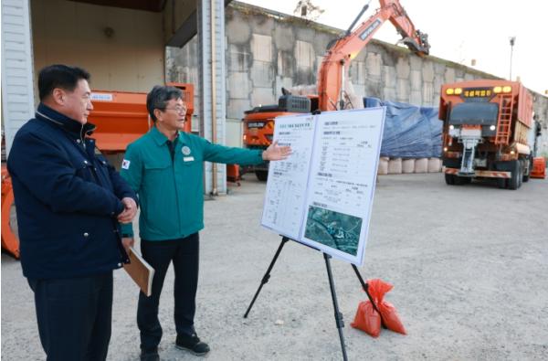 정영철 군수는 25일 군 제설 전진기지를 방문해 제설 장비와 자재 비축 상황, 근무 체계 등을 꼼꼼히 점검하고 현장 근무자들을 격려했다.