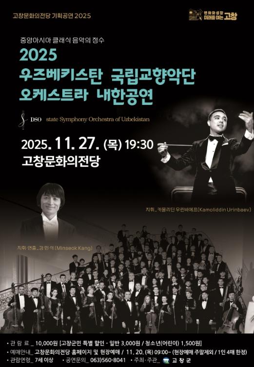 [한국제일신문, 이미란기자] 오는 27일 저녁 7시30분 고창문화의전당에서 ‘우즈베키스탄 국립교향악단 오케스트라 내한공연’이 진행된다.