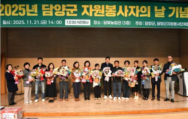 [한국제일신문, 윤진성기자] 담양군은 21일 담빛농업관에서 자원봉사자 200여 명이 참석한 가운데 ‘2025 담양군자원봉사자 기념식’을 열고 올해 지역에서 활동한 자원봉사자들의 노고를 격려했다.