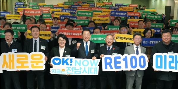 김영록 지사는 개회사에서 “전남은 풍부한 재생에너지와 부산물 순환 구조를 갖춘 국내 최고 수준의 첨단 소재 생태계를 보유하고 있다”며 “순천·광양을 중심으로 RE100 기반 미래첨단 국가산단을 조성해 새로운 산업 성장축을 만들겠다”고 밝혔다.
