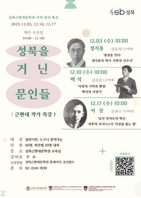 이번 특강은 성북근현대문학관과 고려대 BK21 국어국문학교육연구단, 국제한국언어문화연구소 HK3.0 컨소시엄 사업단이 공동 기획한 프로그램으로, 성북의 문학적 지층을 형성한 주요 근현대 작가 세 명을 집중 조명한다. 정지용·백석·이상을 주제로 총 3회차로 구성됐으며, 회차별 강의는 다음과 같다.