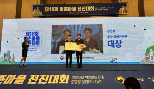 [한국제일신문, 윤진성기자] 전라남도해양수산과학원은 오늘 경주에서 열린 제18회 어촌마을 전진대회에서 2020년 전남귀어학교 제2기 수료생인 완도 김진호(46) 씨가 우수 귀어귀촌인 대상에 선정돼 해양수산부 장관 표창을 받았다고 밝혔다.