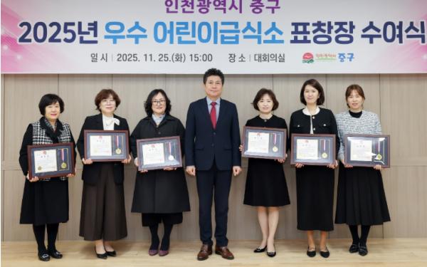 [한국제일신문, 김성옥기자] 인천시 중구는 올 한 해 어린이 급식환경 개선에 앞장선 모범 어린이급식소에 대한 노고를 격려하고자 지난 25일 중구 제2청 회의실에서 ‘2025년 우수 어린이급식소 표창장 수여식’을 개최했다.