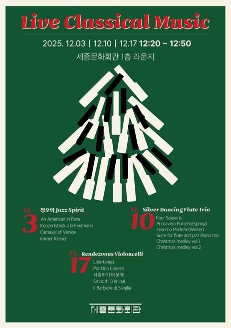 새로운 예술 플랫폼 ‘세종라운지’에서 진행되는 '수요라운지음악회'는 오는 12월, 점심시간을 활용해 특별한 연주를 선보인다. 12월 3일 첫 무대는 ‘정오의 Jazz Spirit’로, 김우연(클라리넷)과 문재원(피아노)이 거슈윈의 '아메리카 인 파리', 슈라이너의 '임머 클라이너' 등 감각적인 레퍼토리를 들려준다. 10일 두 번째 공연에서는 ‘Silver Dancing Flute Trio’가 무대에 오른다. 정예찬(피아노), 변상훈(플루트), 채태웅(첼로)이 피아졸라 'Four Seasons 중 Spring·Winter', 크리스마스 메들리 등 활기 넘치는 연주를 선사한다. 17일 마지막 무대는 4첼로 앙상블로 꾸며지며, 홍채원·조윤서·조이한·채지웅 첼리스트가 탱고부터 대중음악, 팝까지 다양한 장르의 곡으로 첼로의 매력을 전하며 연말 분위기를 뜨겁게 달굴 예정이다.