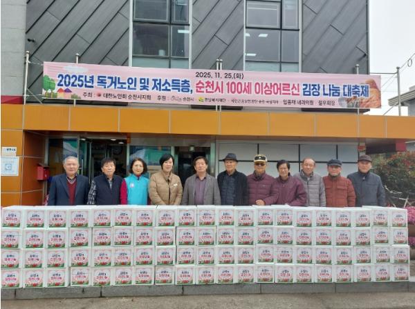 [한국제일신문, 윤진성기자] 대한노인회 순천시지회(회장 김영수)는 지난 25일 순천시노인회관 주차장에서 독거노인과 취약계층 어르신 300여 세대를 위한 ‘사랑의 김장 나눔’ 행사를 추진했다고 밝혔다.