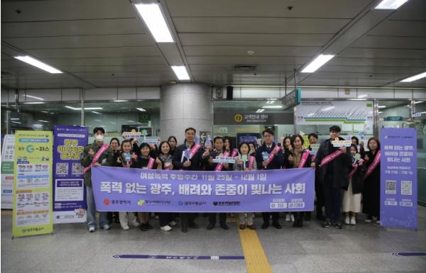 광주교통공사(사장 조익문)가 ‘세계 여성 폭력 추방 주간(11월 25일~ 12월 1일)’을 맞아 25일 서구 상무역에서 인권 존중 문화 확산을 위한 유관 기관 합동 캠페인을 펼쳤다.
