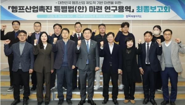 도는 26일 도청 종합상황실에서 '헴프산업촉진 특별법안 보완 및 조문별 조서작성 연구용역' 최종보고회를 개최했다. 이날 보고회에는 도와 새만금개발청, 헴프 관련 기업, 외부 전문가, 용역 수행기관 등 30여 명이 참석해 특별법 제정의 필요성과 추진 전략을 논의했다.
