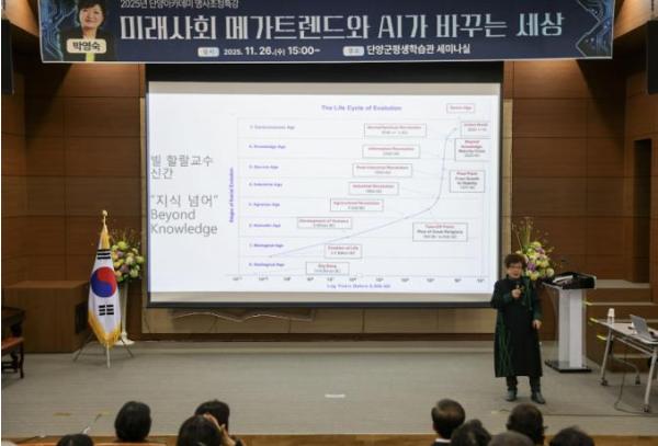 [한국제일신문, 김성옥기자] 단양군은 지난 26일 단양평생학습관에서 열린 ‘단양군 명사초청 특강’에 미래전략 분야의 권위자인 박영숙 미래연구가를 초청해 '미래사회 메가트렌드와 AI가 바꾸는 세상'특강을 성황리에 마무리했다고 밝혔다.