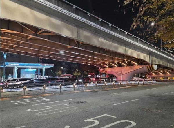 구는 이러한 문제점을 개선하기 위해 고가 하부 구조와 보행자의 보행 동선을 분석해 경관조명 235개, 투광등 68개, 물결등 24개 등 총 327등을 설치했다. 설치된 조명은 부드럽고 따듯한 느낌의 3,000K 색온도로 교량 하부와 안전 펜스에 균형 있게 배치돼 고가 구조물에 의해 발생하는 음영 구간을 최소화하고 야간 운전자의 원활한 시야도 확보될 수 있을 것으로 기대된다.