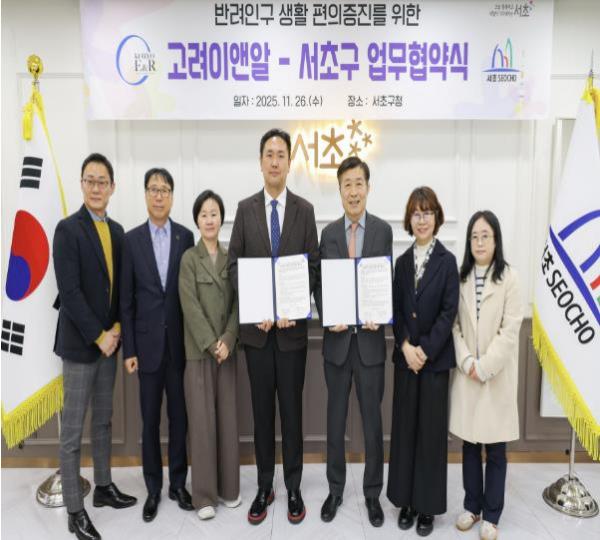 [한국제일신문, 김성옥기자] 서울 서초구는 26일, 반려인구의 지속적 증가에 대응해 반려인의 생활편의를 높이고 쾌적한 공원 환경을 조성하기 위해 환경관리 전문업체 ㈜고려이앤알과 '반려견 분변수거함 확대 설치 및 관리에 관한 업무협약(MOU)'을 체결했다고 밝혔다.