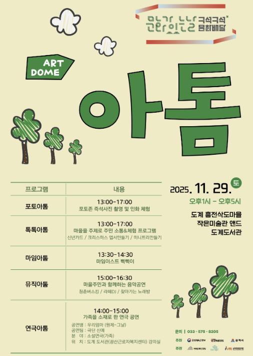 오는 11월 문화가 있는 날 주간에 맞춰 도계읍에 새롭게 조성된 ‘오픈 스페이스 파빌리온 돔(DOME)’을 중심으로 도계 흥전삭도마을, 도계 작은미술관 앤드, 도계도서관 등에서 체험·공연·연극을 즐길 수 있도록 구성됐다.