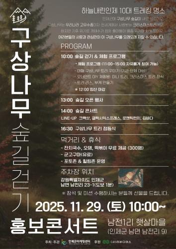 [한국제일신문, 김성옥기자] 인제군마케팅센터는 오는 11월 29일 남면 남전리 일원에서 ‘구상나무 숲길 걷기 홍보 콘서트’를 개최한다. 이번 행사는 남전리 지역에 새롭게 개방된 약 6,500그루 규모의 구상나무 숲길을 주민과 관광객에게 소개하고, 구상나무 보전 가치를 널리 알리기 위해 마련됐다.