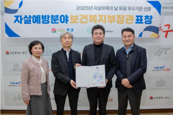 [한국제일신문, 김성옥기자] 인천 중구정신건강복지센터는 2025년 ‘자살 유족의 날’을 맞아 자살 예방 분야 우수기관으로 선정돼 보건복지부 장관 표창을 받았다고 27일 밝혔다.