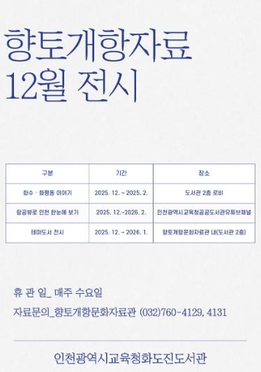 [한국제일신문, 김성옥기자] 인천광역시교육청화도진도서관은 올해 12월부터 2026년 1월까지 지역문화와 향토자료를 주제로 전시 프로그램을 운영한다.
